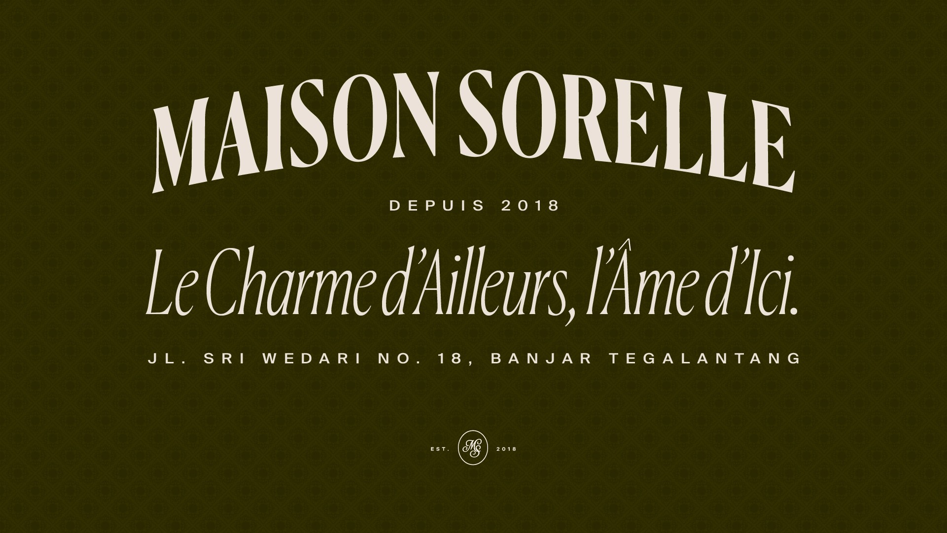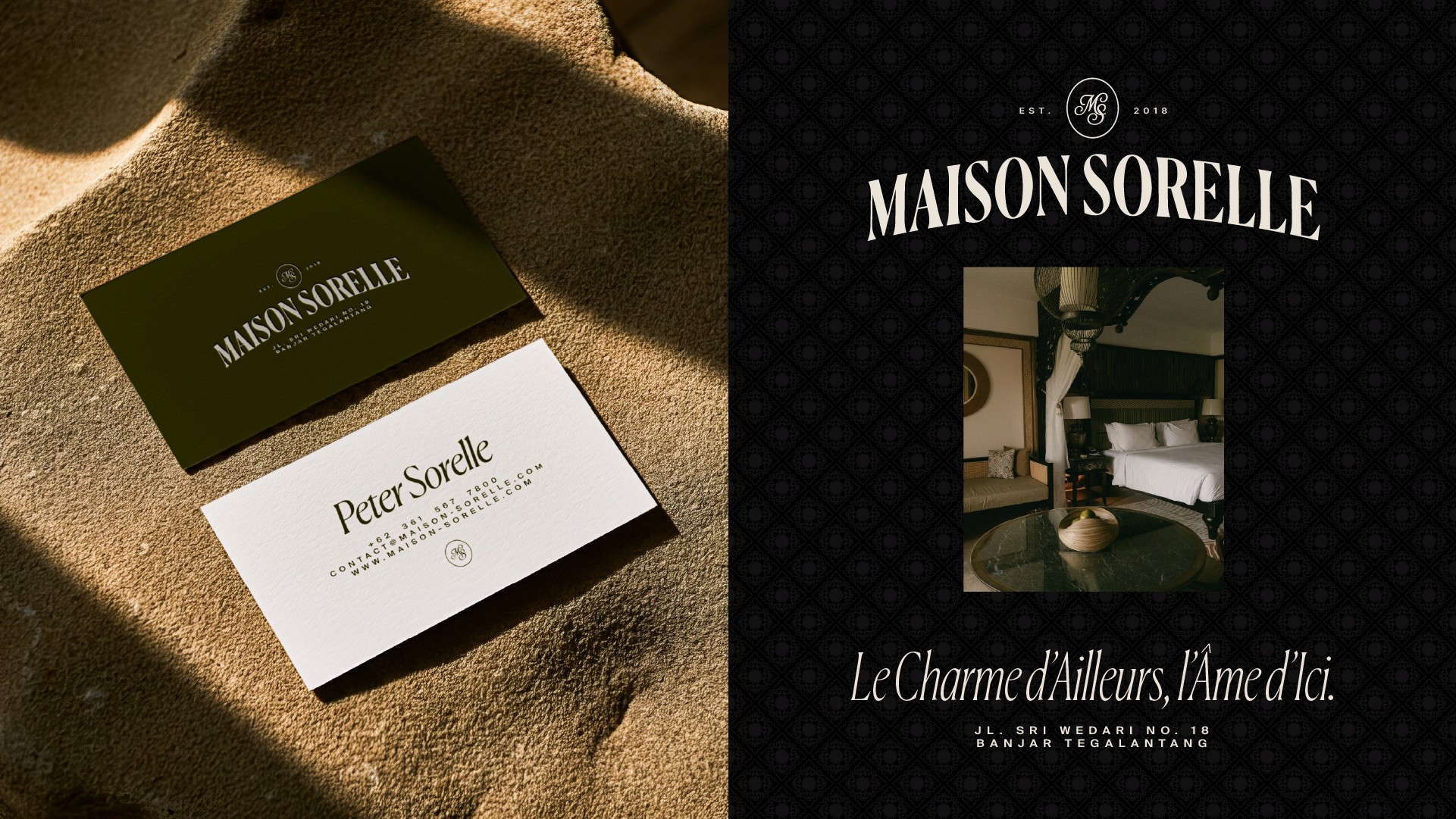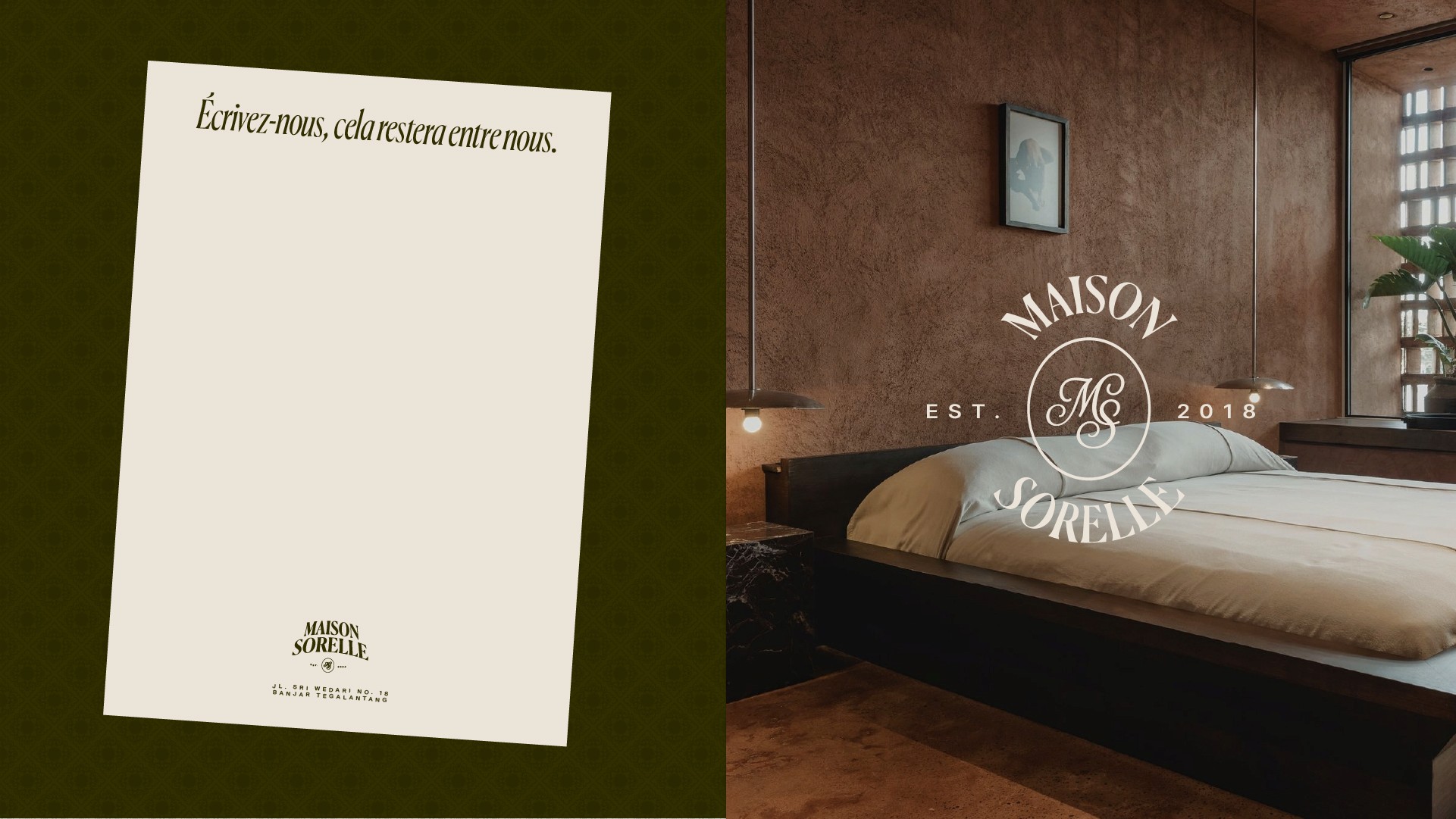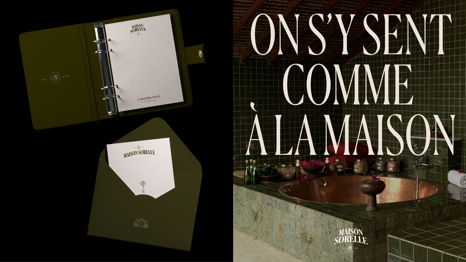 Maison Sorelle déploie une identité visuelle empreinte de douceur et d’élégance, où la nature luxuriante dialogue avec une typographie raffinée et intemporelle. Les teintes profondes, les matières organiques et la lumière tamisée composent un univers chaleureux et intimiste, évoquant à la fois l’évasion et l’ancrage. Entre charme d’ailleurs et âme d’ici, l’esthétique de Maison Sorelle traduit l’idée d’un refuge poétique : une maison habitée par le lien, la sérénité et l’art de recevoir.